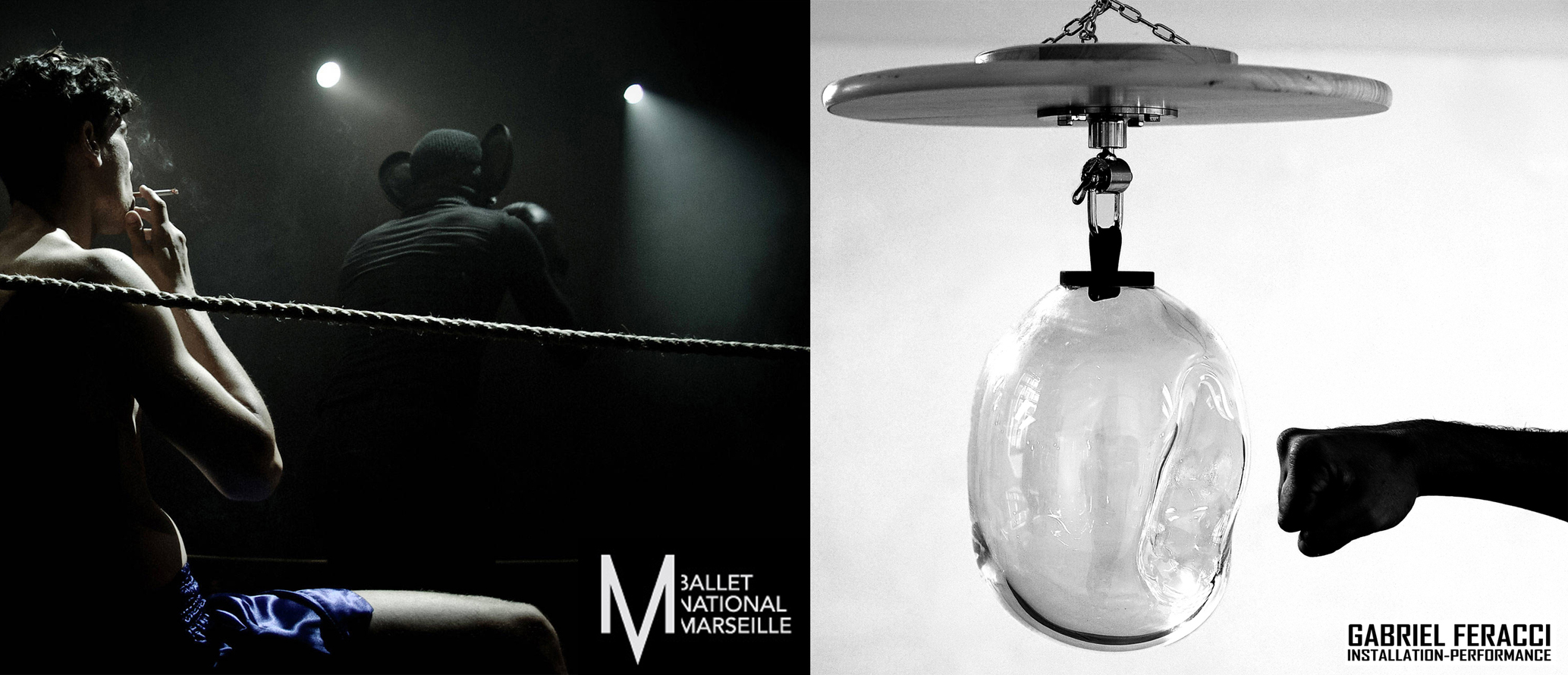 Gabriel Feracci choisit la confrontation directe entre corps et matériau pour explorer la notion de limite. Et c’est au-dessus d’un ring que l’artiste présente sa série de sculptures en verres : Souffles (2015), ce sont deux énergies qui se conjuguent, celle du souffleur de verre qui donne vie à la matière et celle de l’artiste qui par la frappe lui donne sa dernière forme.