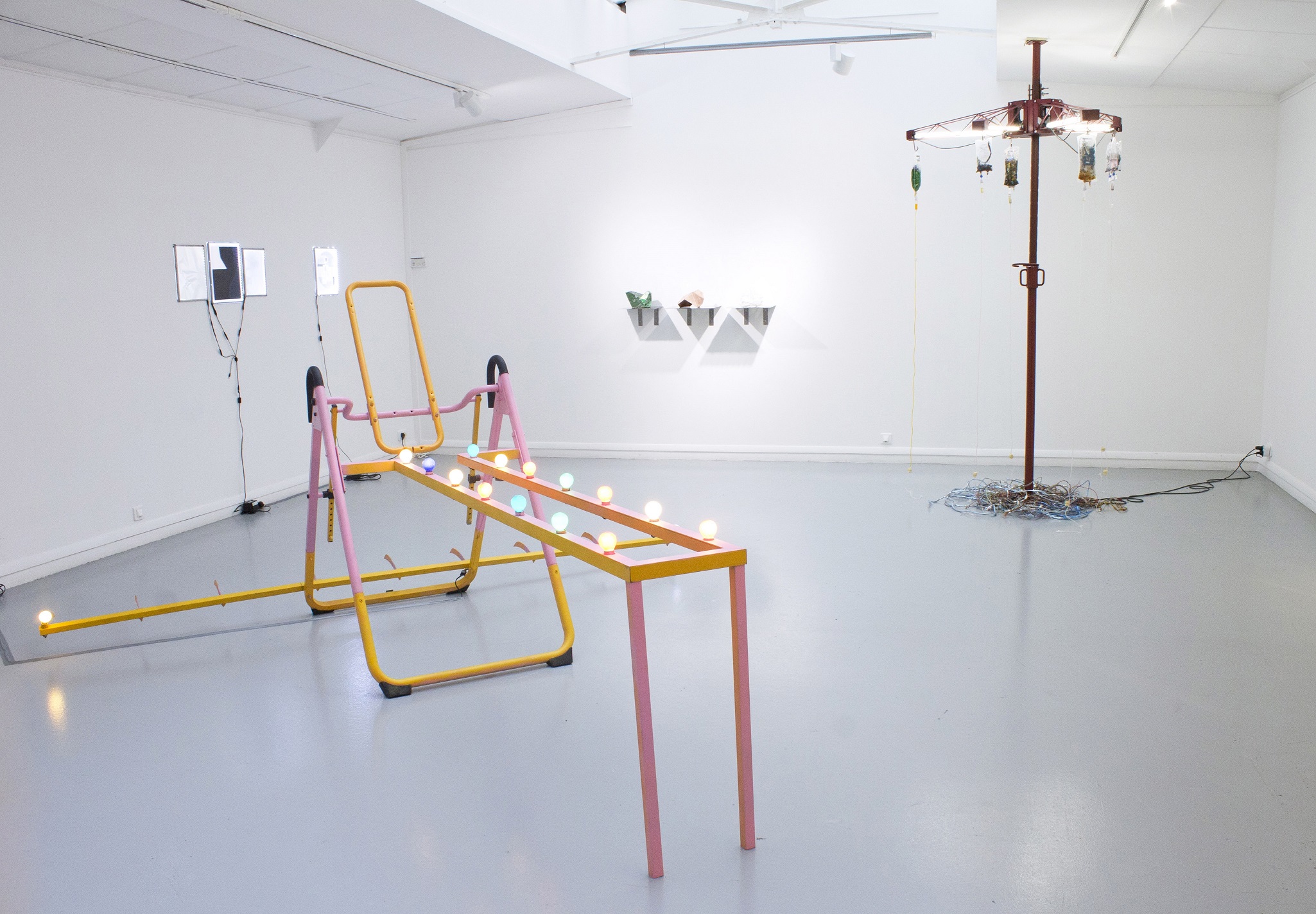 , Moissonneuse-foireuse, 2015, 350 x 200 x 170 cm, métal peint, système lumineux. (Arrière plan) Mât de Cocagne, 2016, 280 x 150 x 150 cm, étai de chantier, métal peint, poches à perfusion, composants électroniques, paillettes, câbles électriques dénudés, t,
