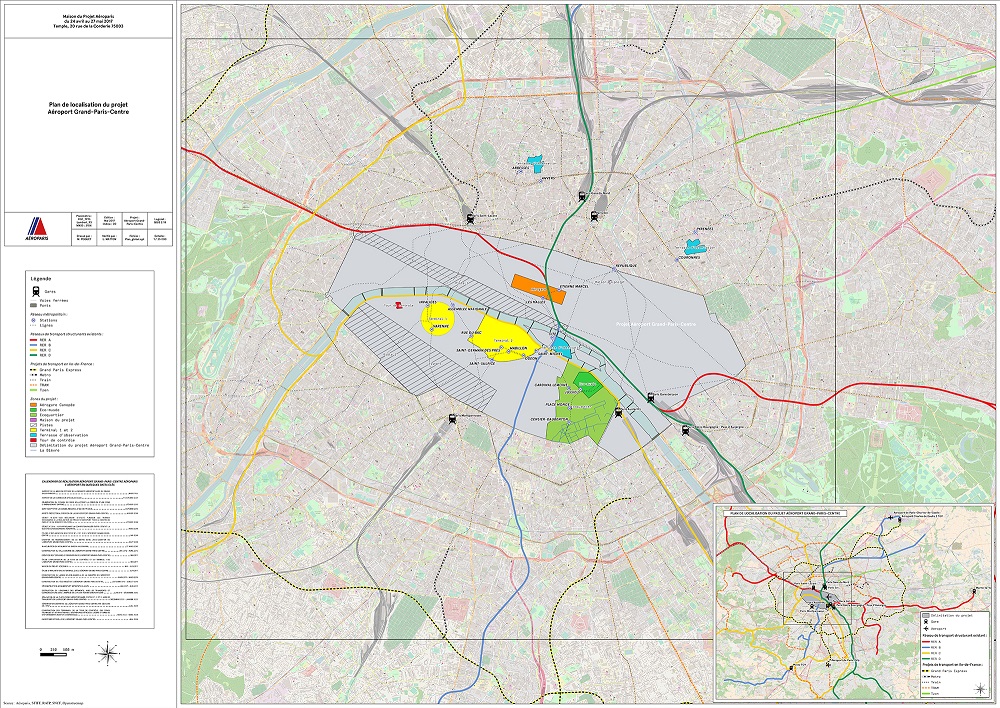 Plan de l’Aéroport Grand-Paris-Centre, 2014-2017. Fond de plan openstreetmap, informations digitalisées, impression jet d’encre pigmentaire, papier mat, feuille A0, production Temple Paris, crédit Aéroparisrecherche