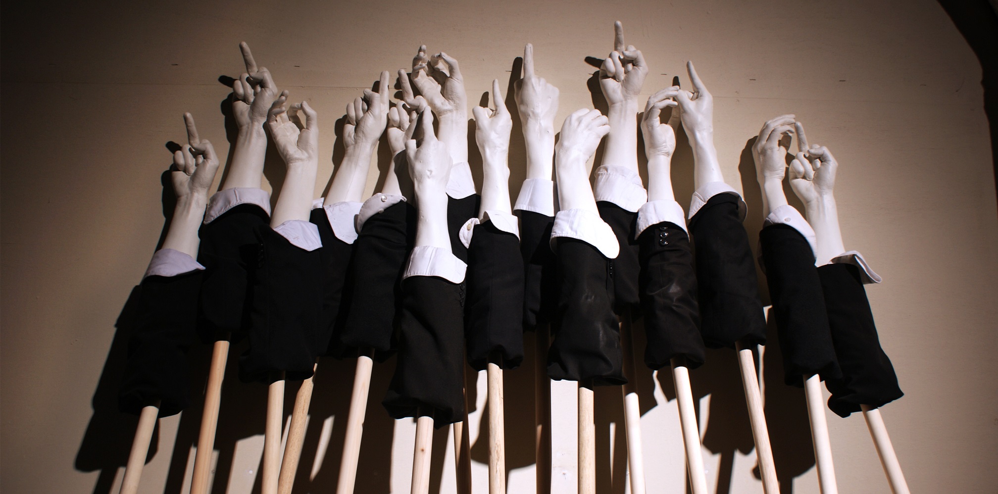 Martin Lewden, The Trial - Résine acrylique, fer, vêtements, bois, 255x200cm, 2015,