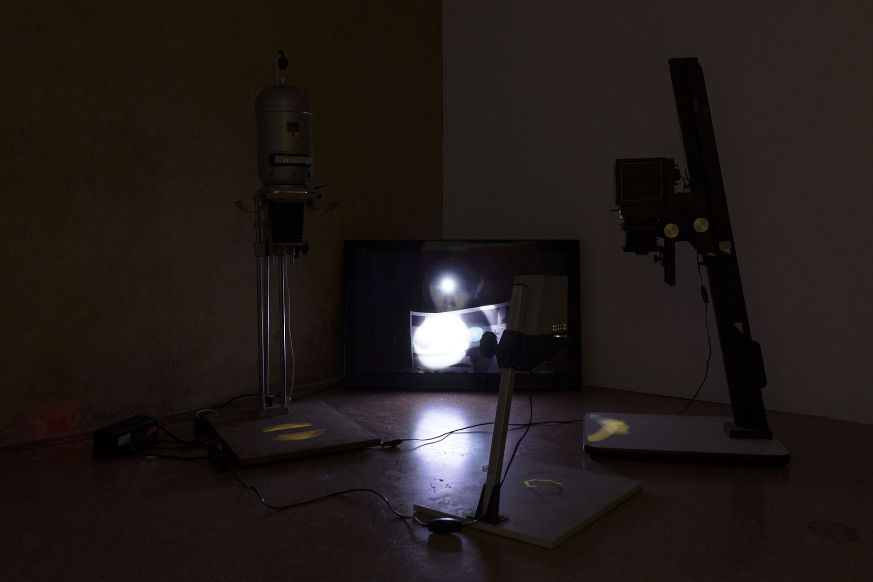 , Tracing Ghosts, vidéo HD sur moniteur, 9 min, agrandisseurs, ampoules, capteur sonore, 2015,