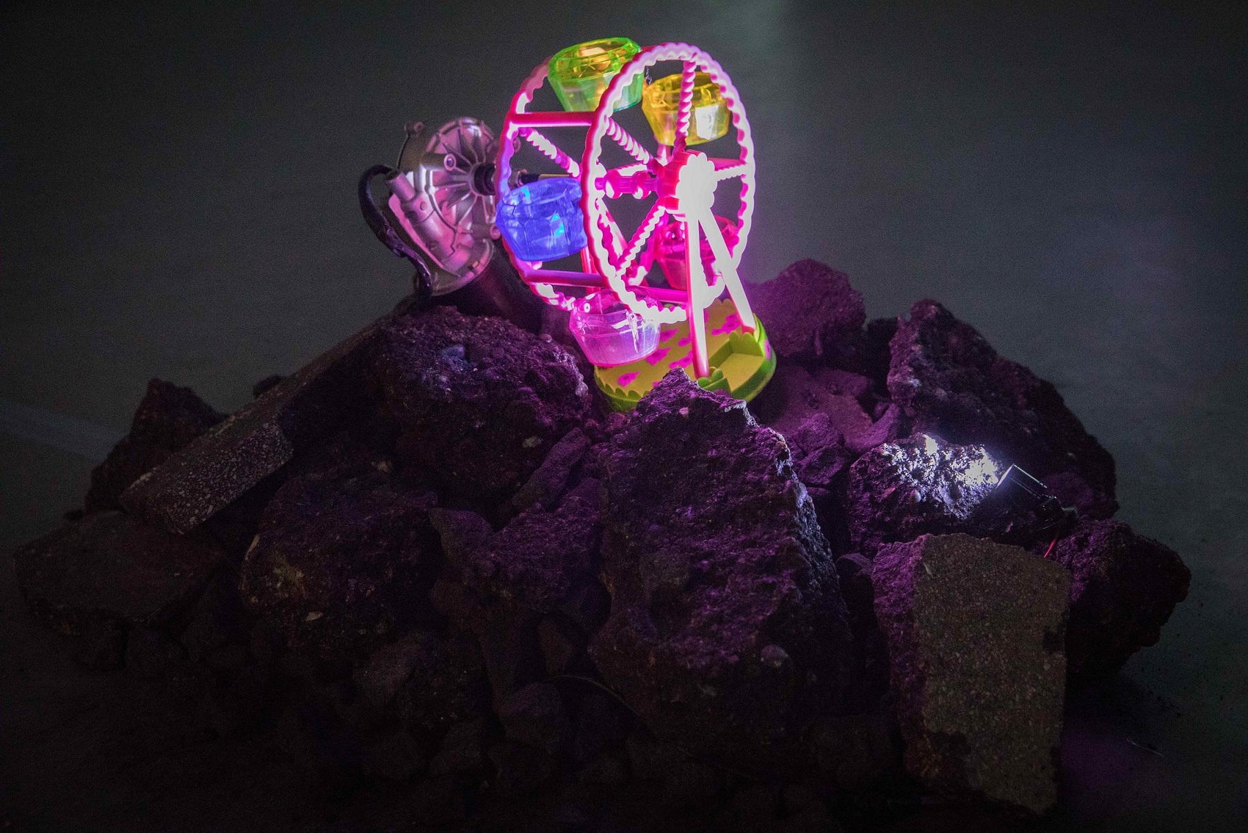 Wir Bauen Zukunft #Ferris Wheel, 2017, env. 80 x 80 x 50 cm, grande roue en plastique, moteur d’essuie-glace, bitume, charbon, système lumineux, crédits : eSel.at.recherche